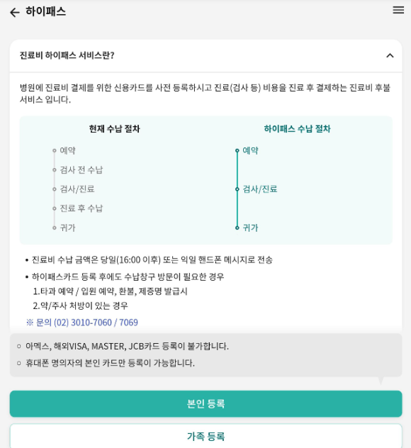 병원에 진료비 결제를 위한 신용카드를 사전 등록하시고 진료 (검사 등) 비용을